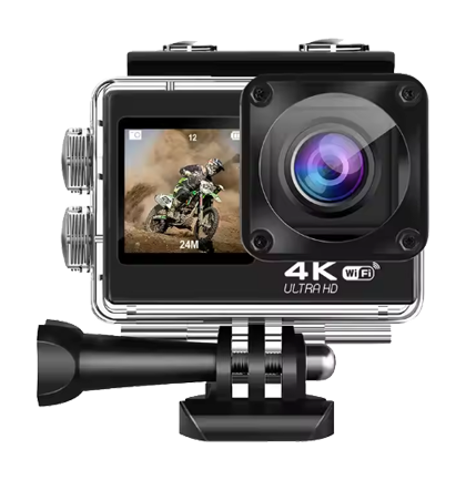 Descripción: Camara digital de acción sumergible con pantalla delantera, mando a distancia y tarjeta de memoria.